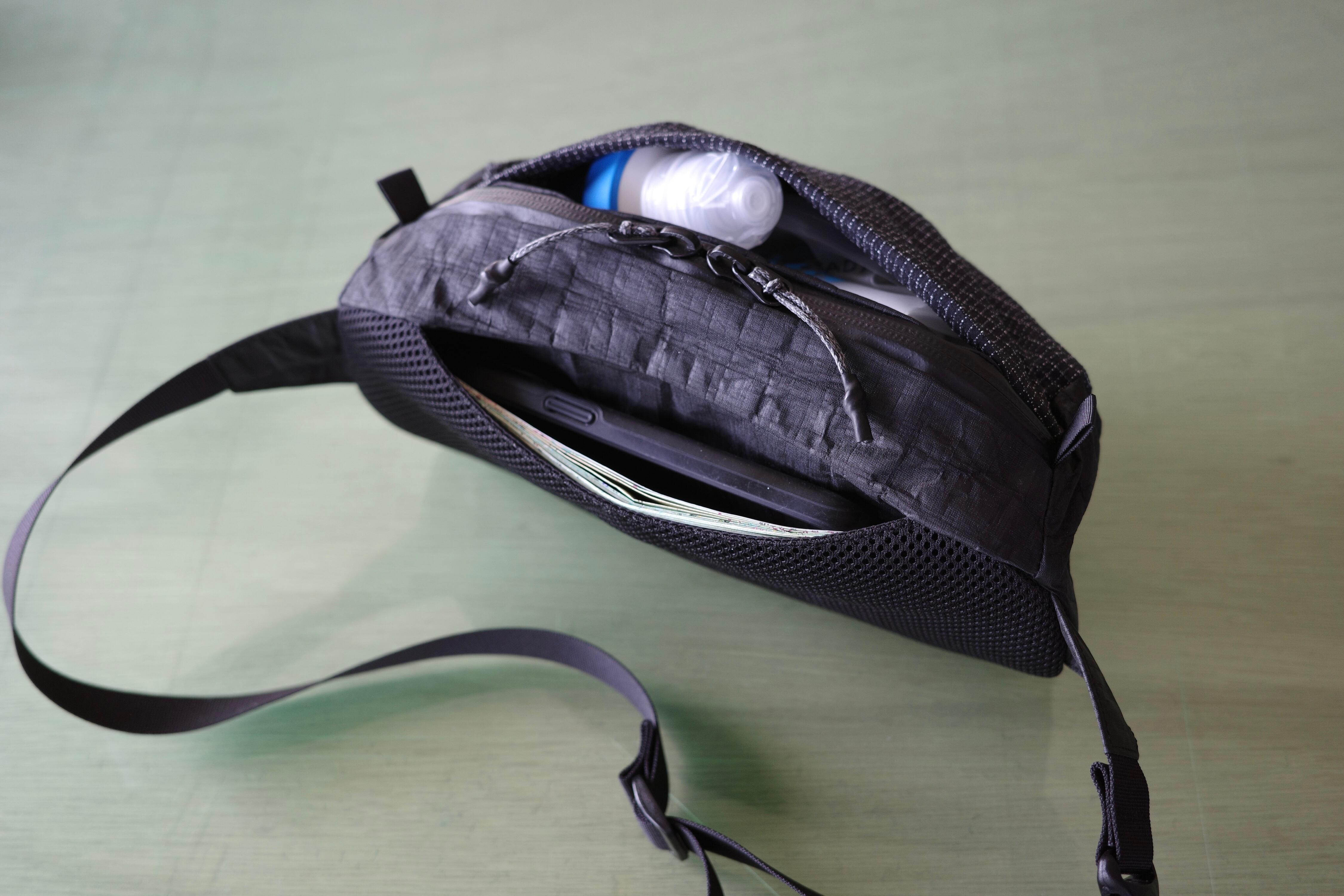 地図やスマホ・補給食やスキンケアなどの携行品をひとまとめに、用途別に使えるポケットを3箇所備えてます。